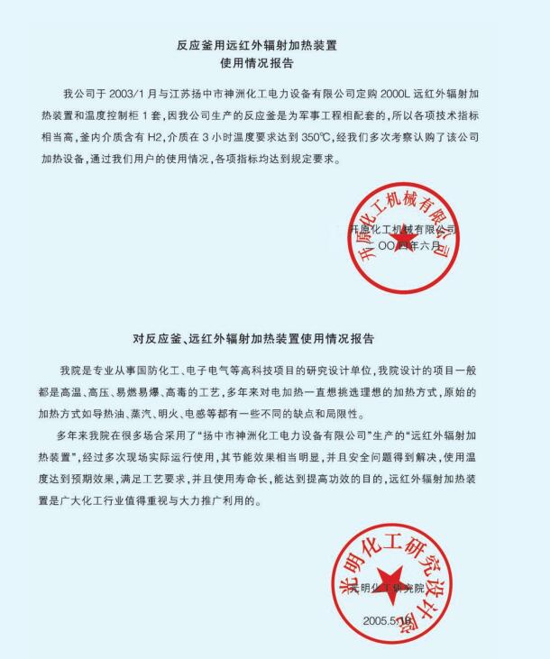 反應釜用遠紅外輻射加熱裝置使用情況報告